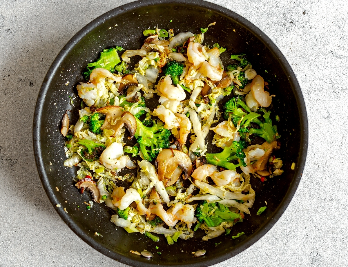 This recipe contains fresh prawns, broccoli florets, mushrooms, Chinese cabbage and bean sprouts. There is a crunch and texture which compliments the rich umami sauce nicely.