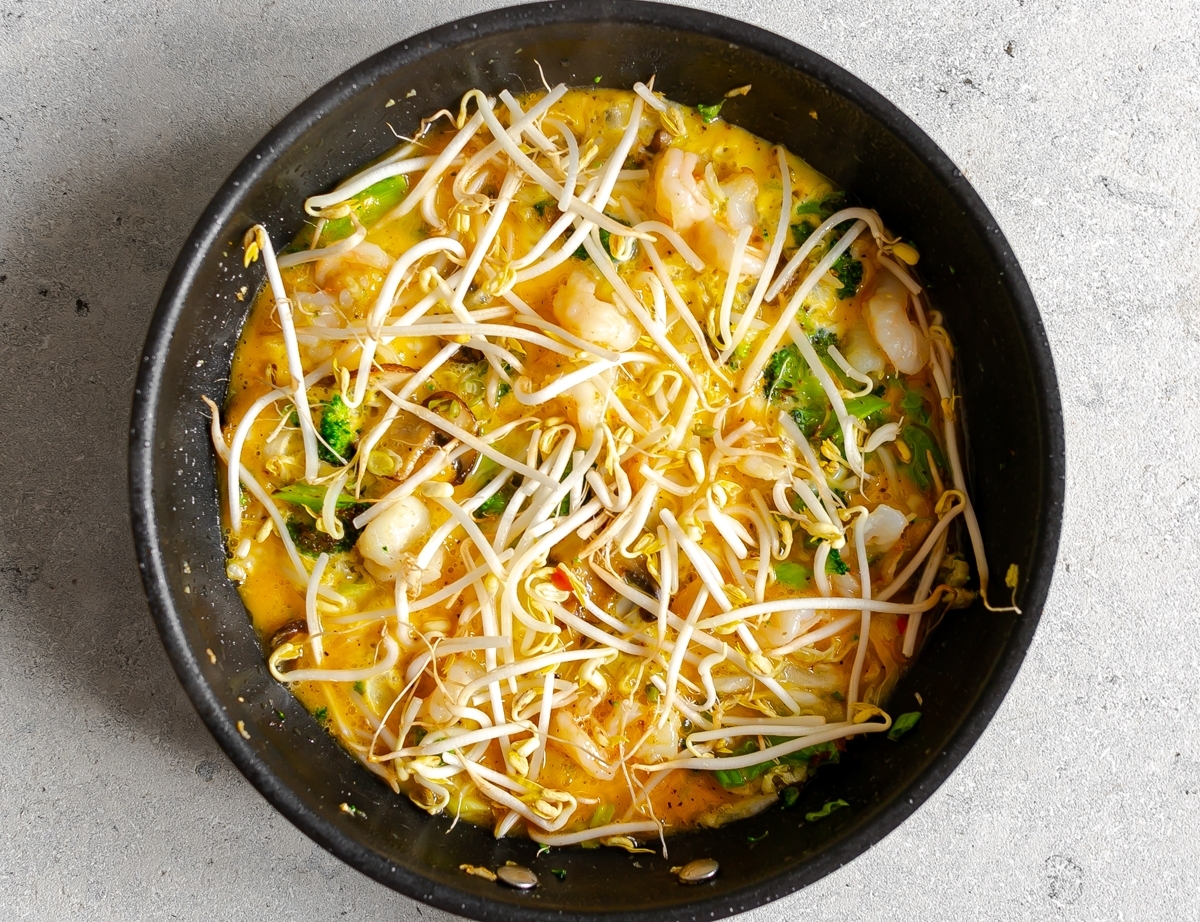 7.  Place prawns into pan and season all the ingredients with a little salt and pepper. Pour over beaten eggs and gently swirl around the pan to coat everything evenly. Cook over medium heat so the bottom doesn’t burn. After 30 seconds scatter with bean sprouts and cover the pan with a lid so the top of the omelette sets.